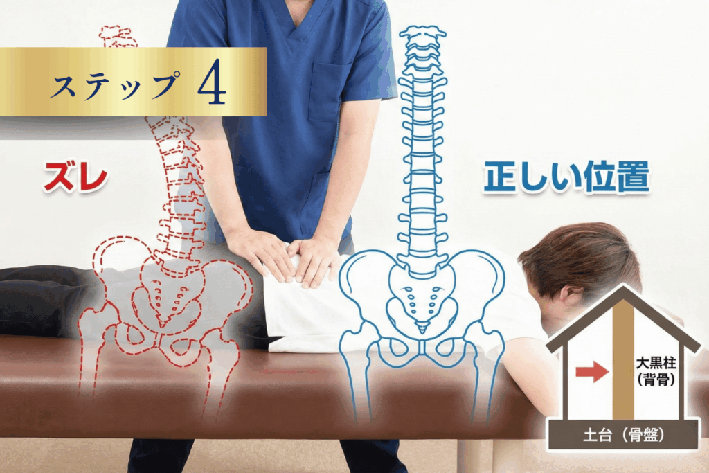 土台となる骨盤と大黒柱である背骨のズレを正しい位置に戻します。