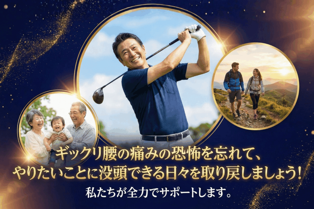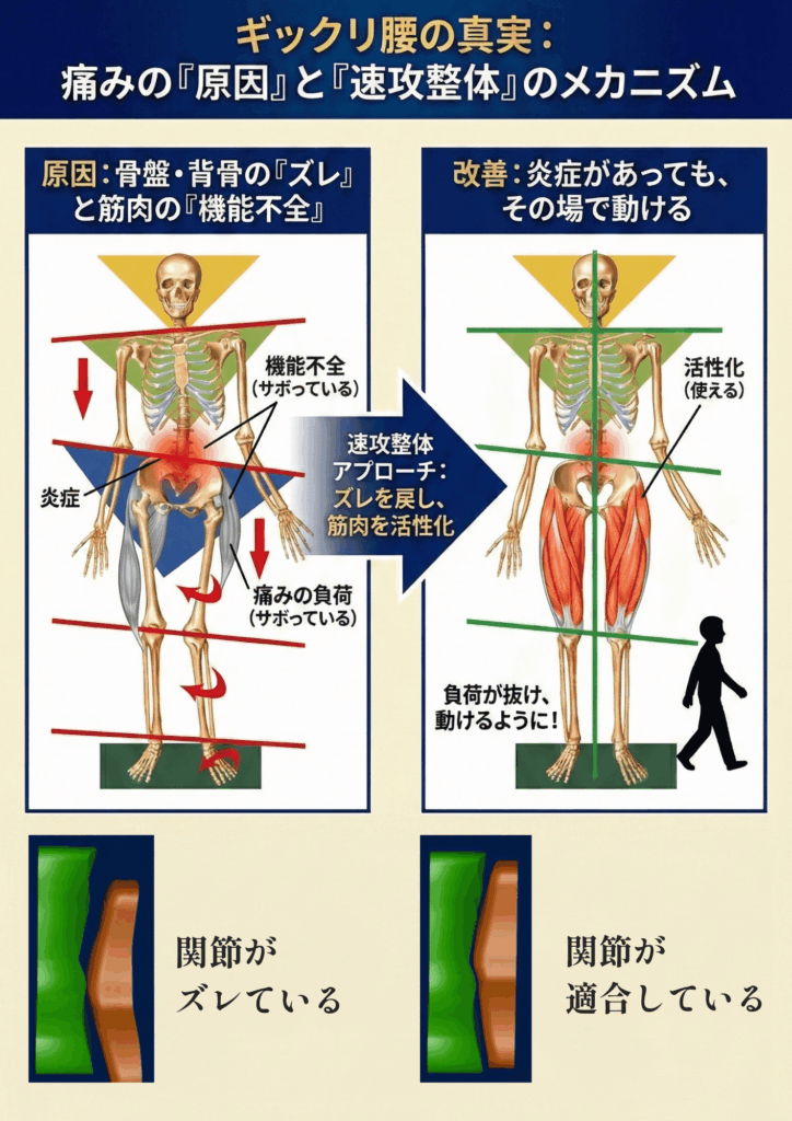 なぜなら、ギックリ腰の本当の原因は腰そのものではなく、骨盤・背骨の『ズレ』と筋肉の『機能不全』だからです。