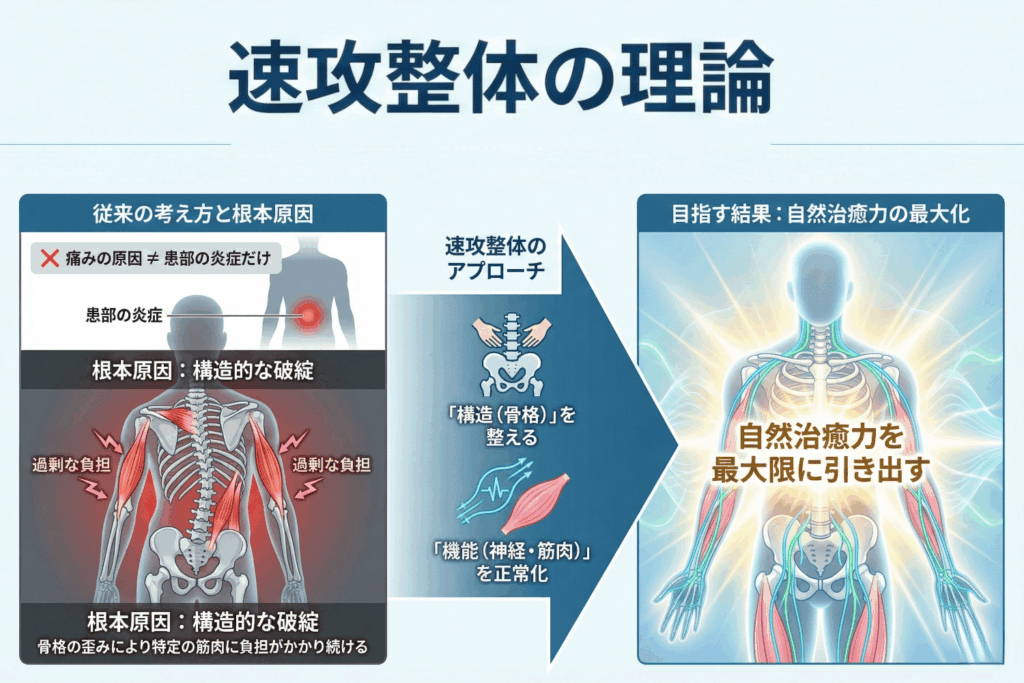 速攻整体では、「構造(骨格)」を整え、「機能(神経・筋肉)」を正常化させることで、人間が本来持っている自然治癒力を最大限に引き出します。