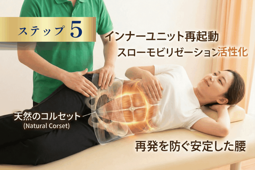 天然のコルセットであるインナーマッスルを活性化させ、再発を防ぐ安定した腰を作ります。